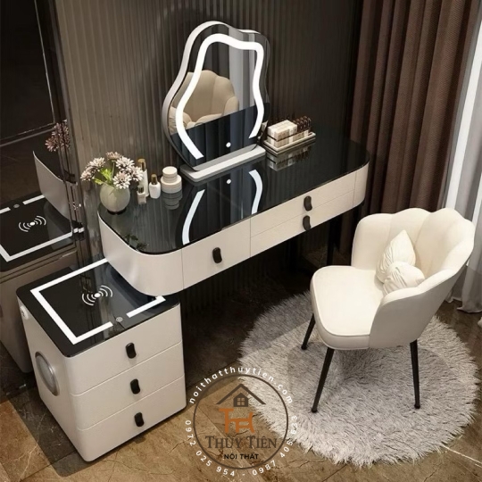 - Gương đèn led xoay cảm ứng 3 màu và ghế ngồi (Sản phẩm tặng kèm khi mua bàn trang điểm).